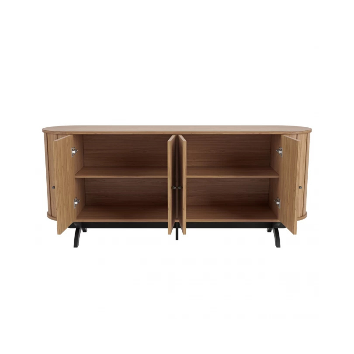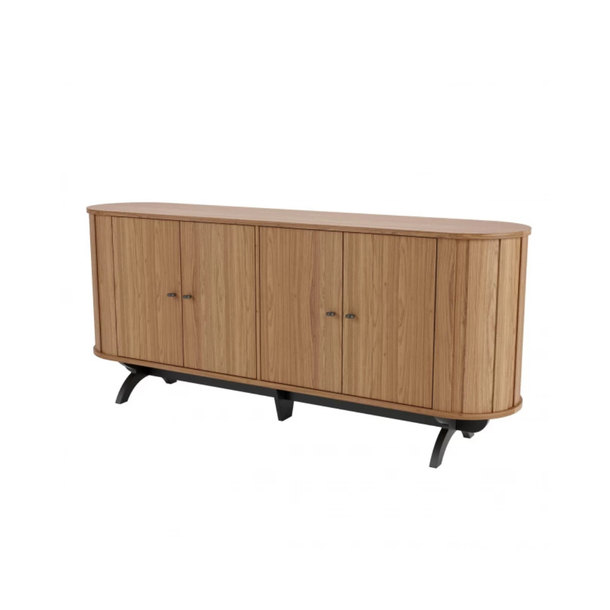 A combinação do freijó com o preto fosco reforça o visual contemporâneo, enquanto as quatro portas oferecem amplo espaço interno para organização. O formato curvo proporciona leveza estética, destacando a peça como um verdadeiro ponto focal na decoração.