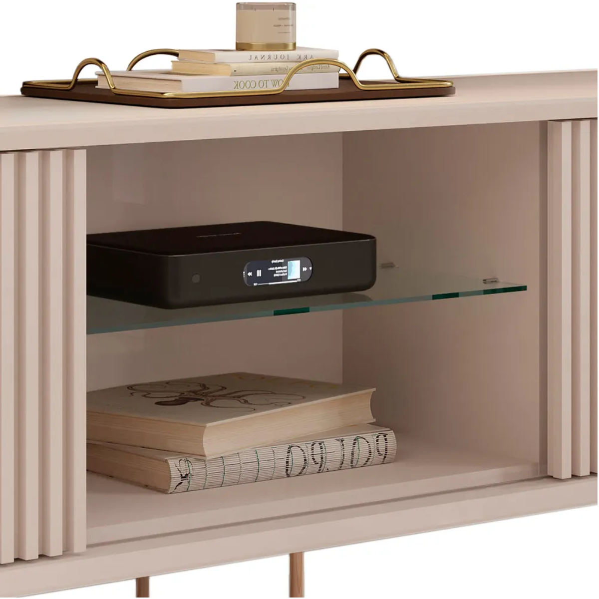 Seu amplo espaço interno é composto por duas portas deslizantes e dois nichos com prateleira de vidro, ideais para acomodar eletrônicos e manter tudo organizado com elegância. Além disso, o passa-fios integrado facilita a organização dos cabos, garantindo uma estética sempre limpa.