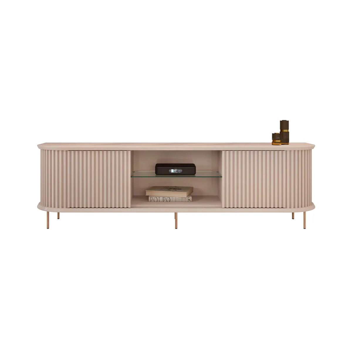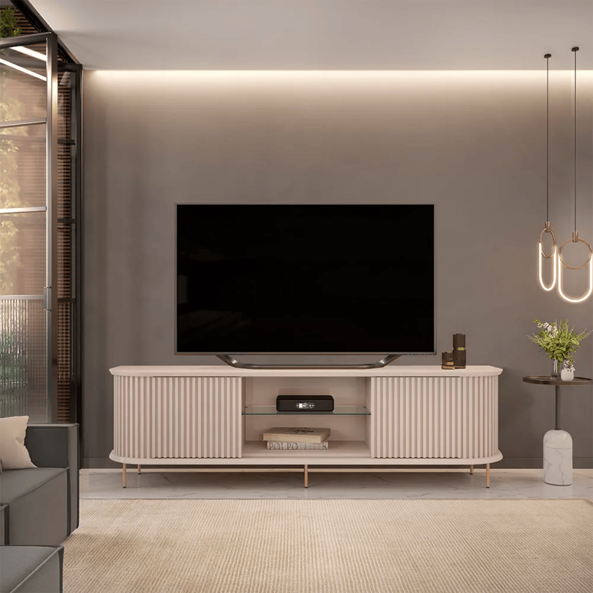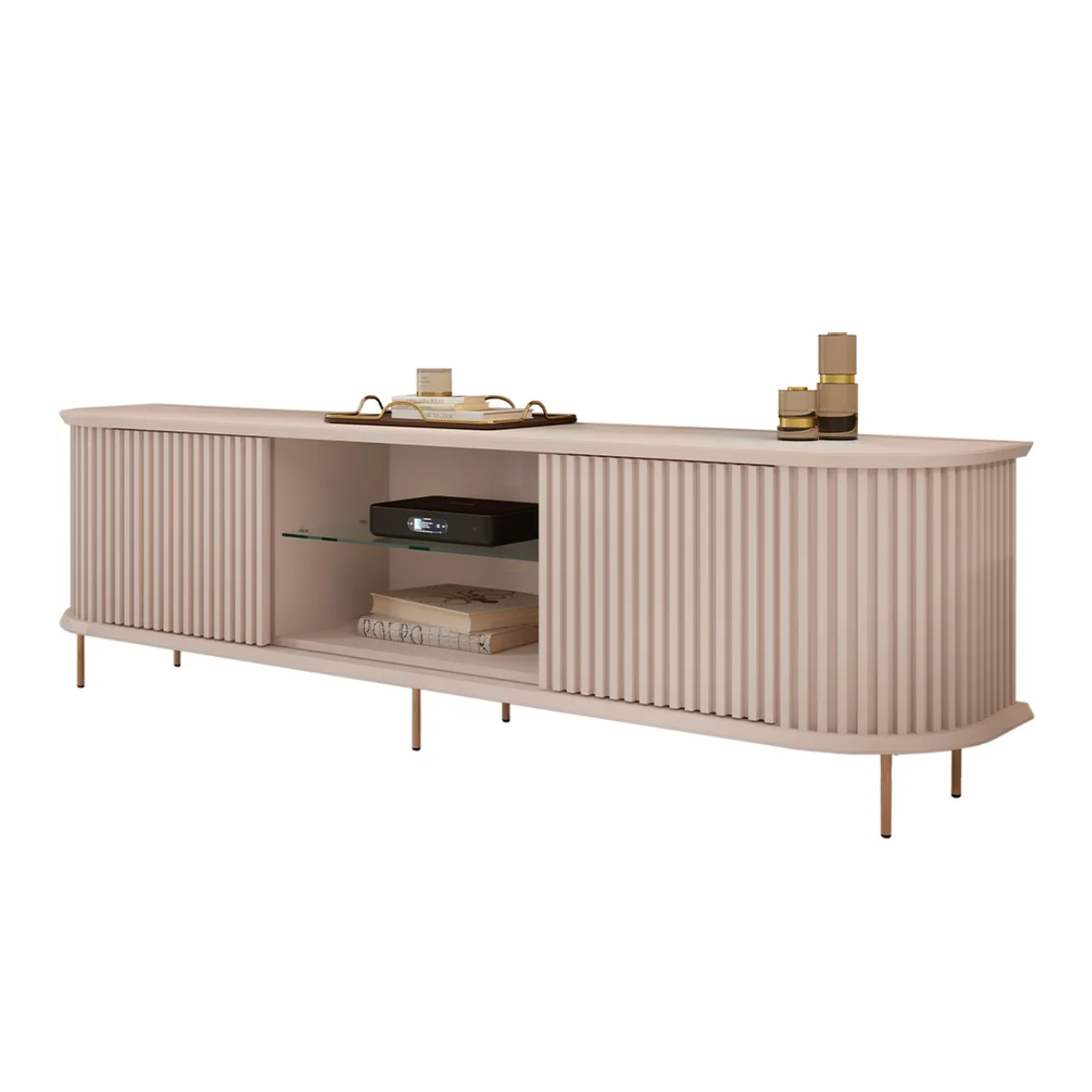 Com design contemporâneo e acabamento de alto padrão, a bancada Atlas é a escolha ideal para quem deseja unir sofisticação, funcionalidade e estilo na sala de estar. Produzida em MDF com acabamento em melamina e pintura PU, ela apresenta estrutura robusta e detalhes refinados, como cantos arredondados, portas ripadas e pés metálicos dourados que trazem charme e modernidade ao ambiente.