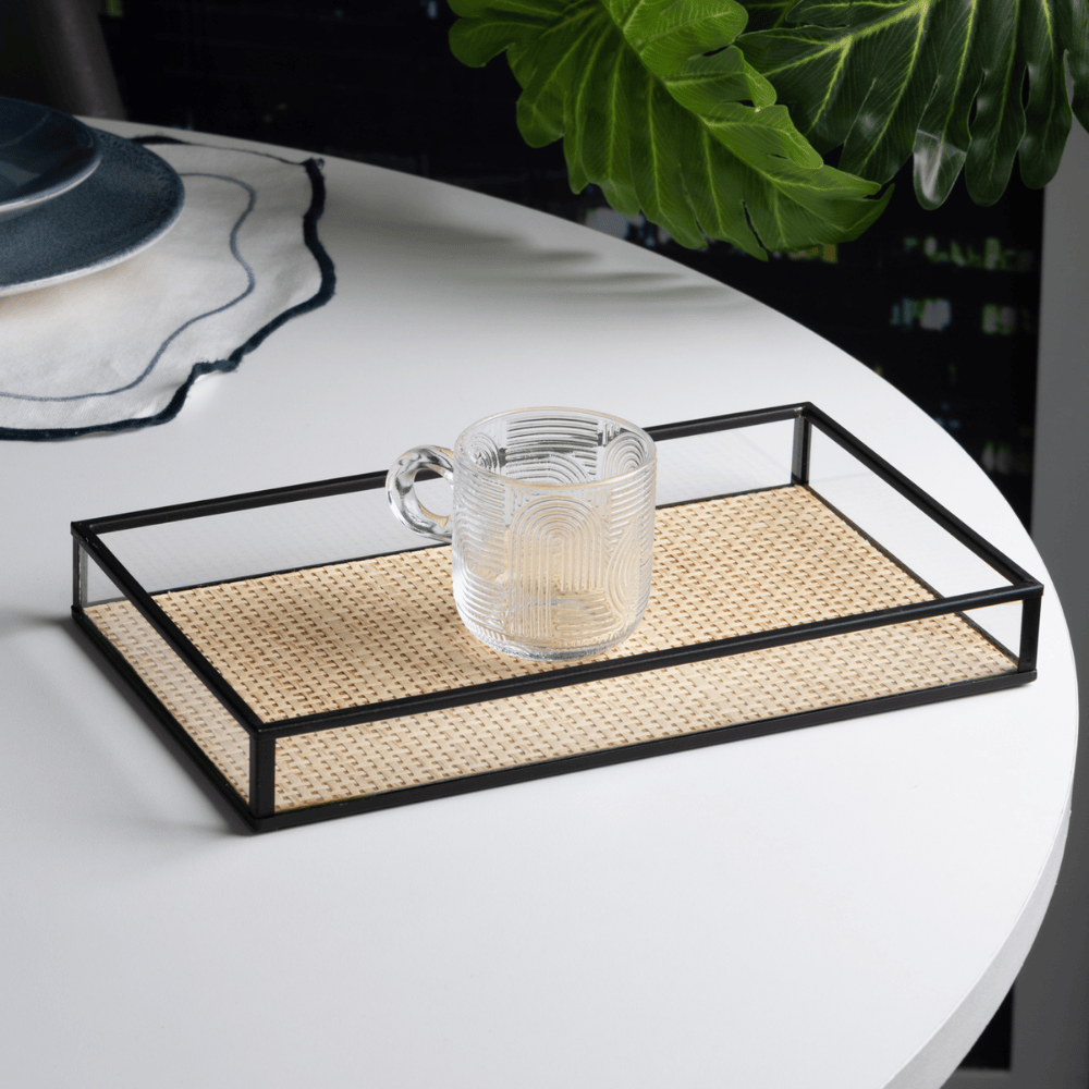 A Bandeja Decorativa Toscana Preto Metal traz elegância e funcionalidade para qualquer ambiente. Com estrutura em metal preto, laterais em vidro e base com textura que remete ao rattan, ela combina modernidade com um toque natural, perfeita para organizar perfumes, acessórios, maquiagens ou compor mesas e aparadores com charme. Seu design retangular compacto facilita o uso em diversos espaços, sem perder o estilo sofisticado.