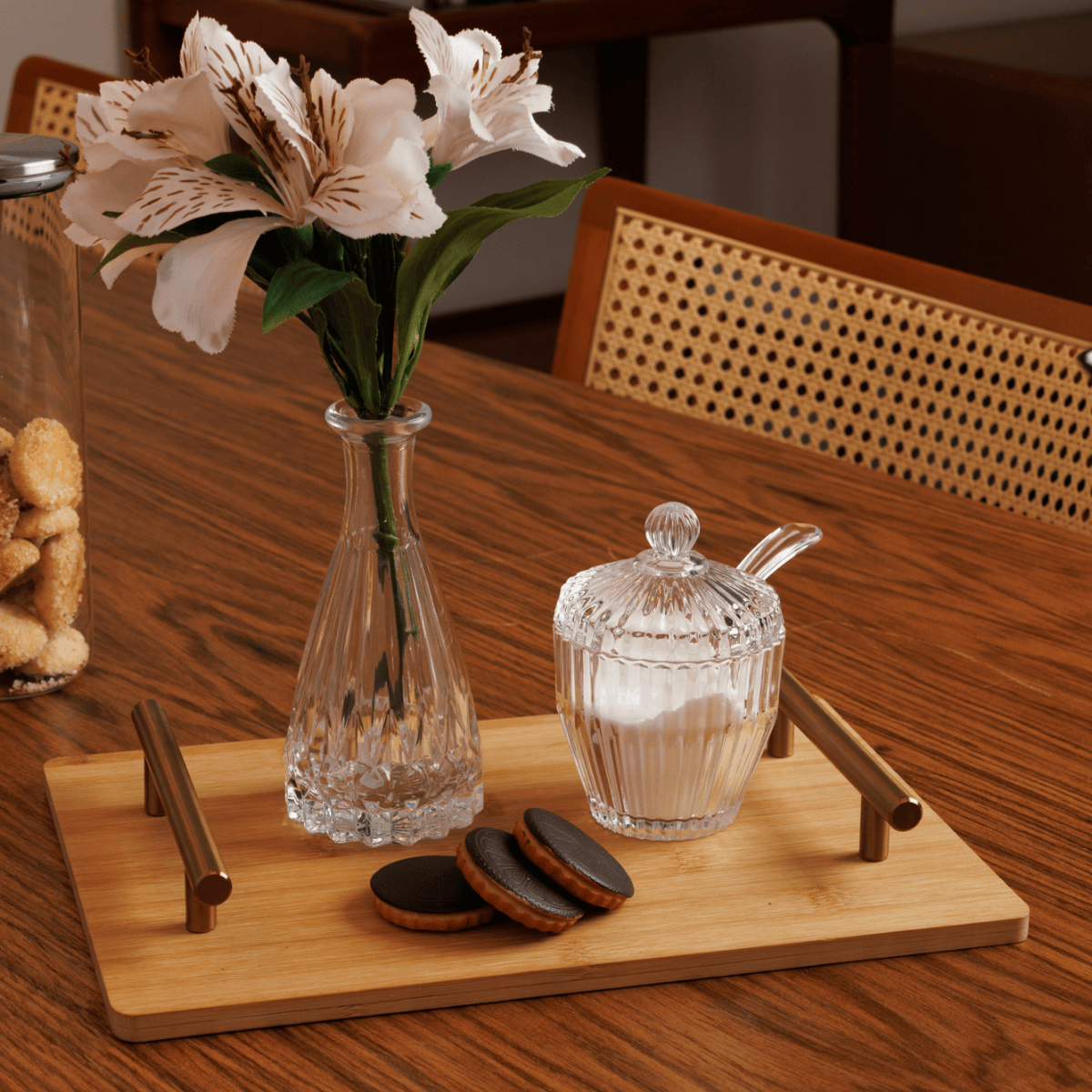 A Bandeja Seattle da Wolff combina funcionalidade e sofisticação em uma peça única para compor a mesa ou servir com estilo. Produzida em bambu natural, traz leveza, resistência e acabamento moderno, enquanto suas alças em metal dourado adicionam um toque contemporâneo e elegante. Com medidas de 30cm x 21cm, é prática para servir cafés, chás, sobremesas ou organizar pequenos objetos no dia a dia. Uma peça versátil que une charme e praticidade, elevando a decoração em qualquer ocasião.