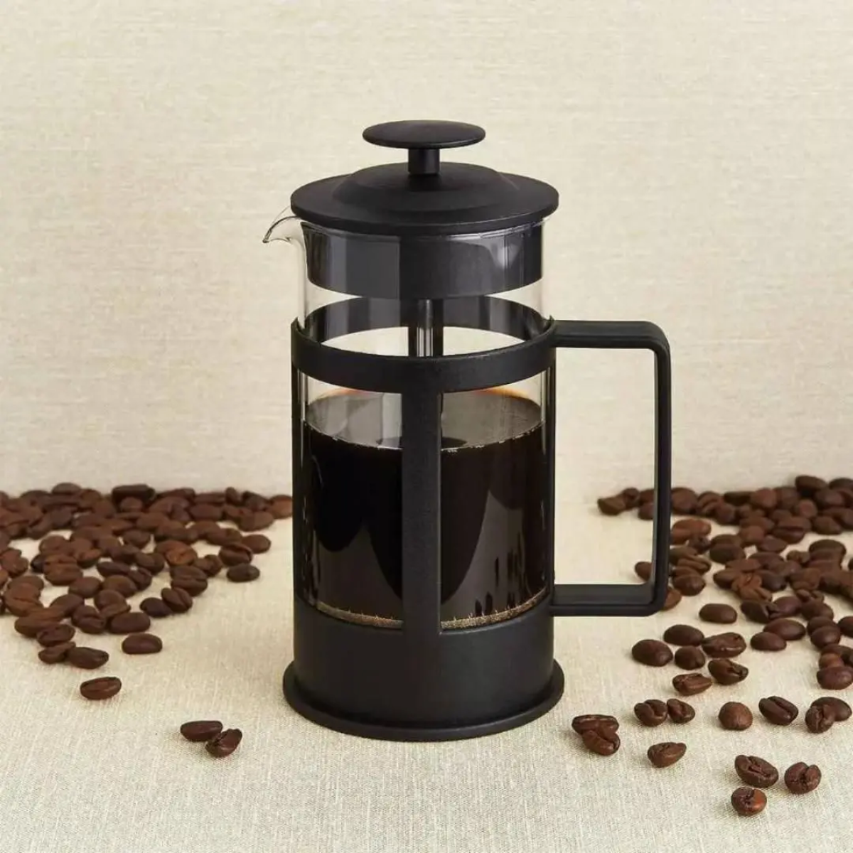 A cafeteira francesa é prática e elegante, perfeita para preparar cafés encorpados e aromáticos de forma rápida e simples. Produzida em vidro resistente com estrutura em plástico preto, garante durabilidade e segurança no manuseio, além de trazer modernidade ao design.