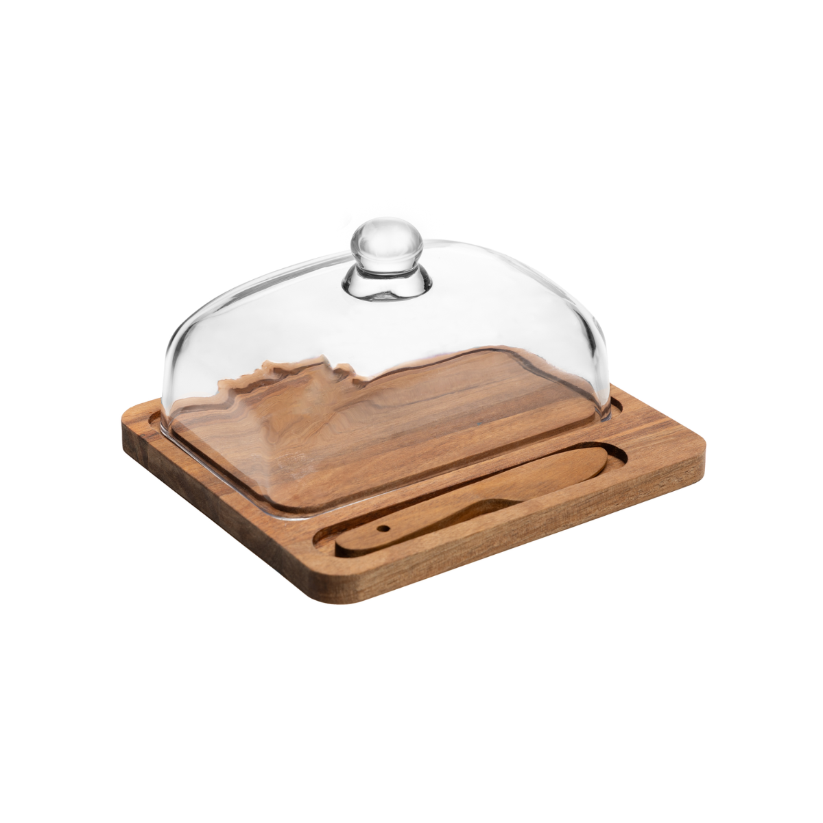 • Material – base em madeira de acácia, cúpula em vidro e faca em madeira