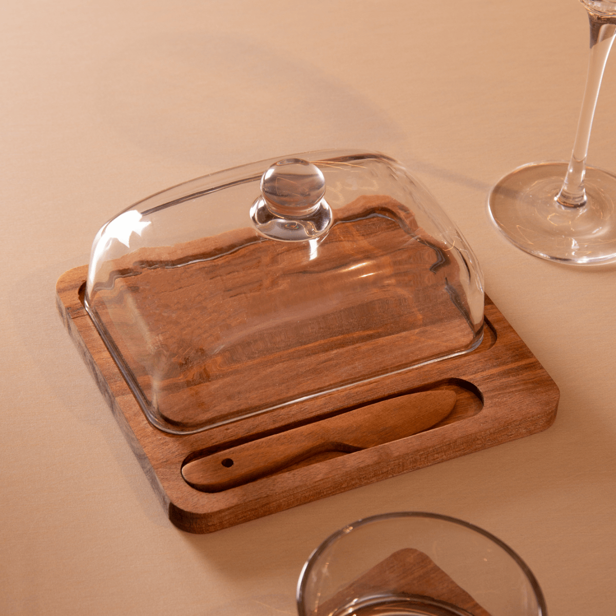 O conjunto de 3 peças manteigueira e faca da linha Lignum é ideal para quem aprecia praticidade aliada ao design natural e sofisticado. A base em madeira de acácia apresenta acabamento polido e veios únicos, que tornam cada peça exclusiva, enquanto a cúpula de vidro transparente protege o alimento, permitindo visualizar o conteúdo com elegância.