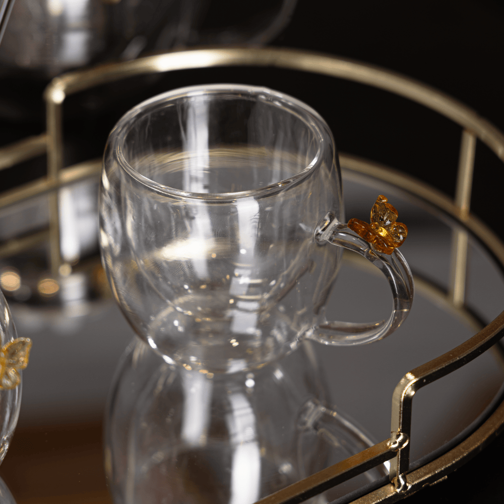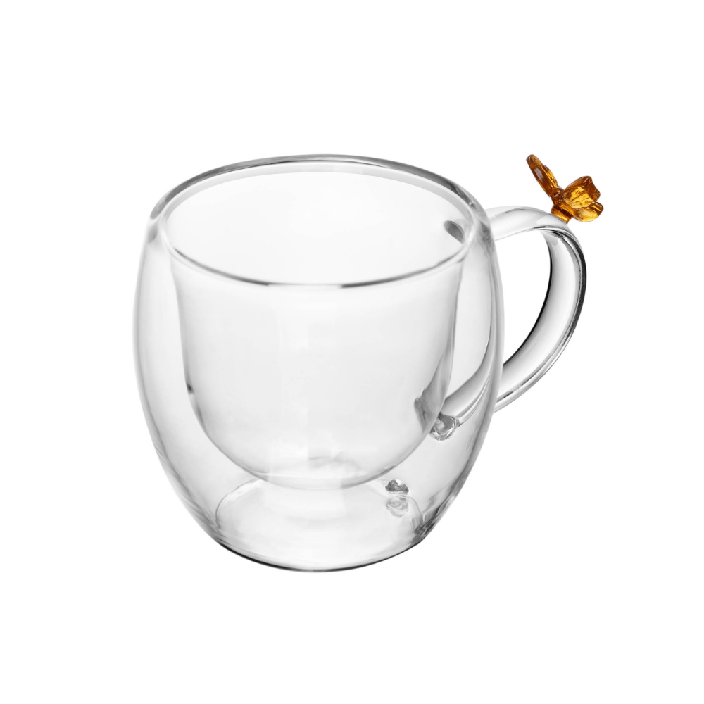 Delicado e contemporâneo, o conjunto Sun Garden traz elegância ao servir café com um toque de originalidade. Produzidas em vidro borossilicato, as xícaras possuem parede dupla que mantém a temperatura da bebida por mais tempo, além de design leve e resistente. O detalhe da borboleta em tom âmbar na alça adiciona charme e sofisticação à peça.