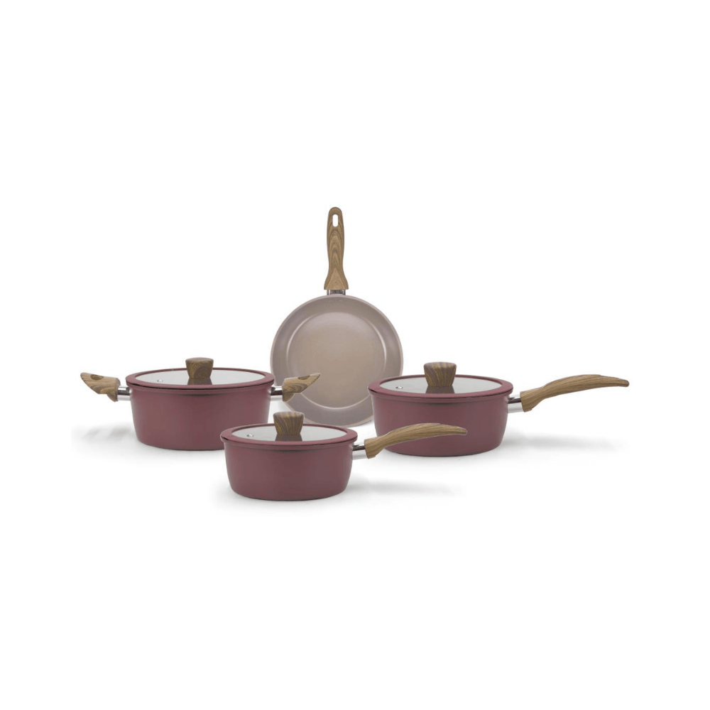 Conjunto de panelas com acabamento rosa moderno e delicado, ideal para quem deseja unir charme e funcionalidade na cozinha. Possui revestimento antiaderente que evita que os alimentos grudem, facilita a limpeza e garante preparo mais prático. Os cabos e pegadores com efeito madeira trazem um toque natural ao design, enquanto as tampas de vidro permitem visualizar o cozimento sem perder vapor.