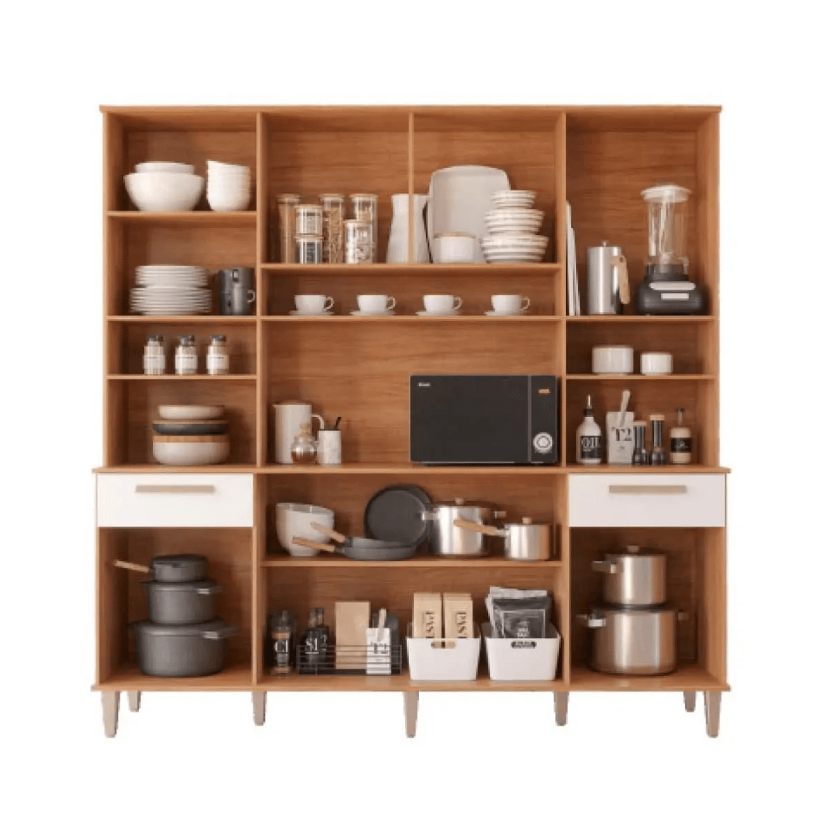 Composta por 8 portas e 2 gavetas, oferece excelente capacidade de organização para utensílios, louças e alimentos. As gavetas com corrediças telescópicas garantem abertura suave e silenciosa, enquanto os puxadores em ABS na cor Gold reforçam o visual refinado do conjunto. Os nichos abertos agregam versatilidade e praticidade ao uso diário.