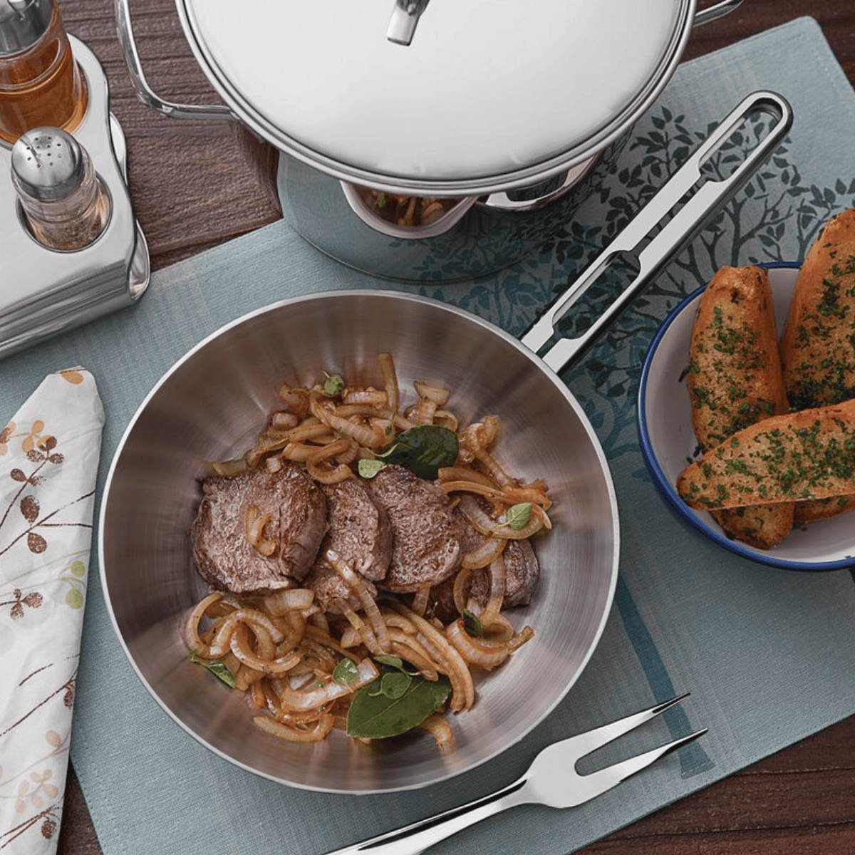 A frigideira Allegra de 24cm é resistente, funcional e indispensável para o preparo das suas receitas favoritas. Produzida em aço inox de alta qualidade, não solta resíduos, preservando o sabor natural dos alimentos. Seu fundo triplo (aço inox + alumínio + aço inox magnético) distribui o calor de maneira uniforme, garantindo cozimento rápido e eficiente, além de economizar energia. Com capacidade de 2,1 litros, é ideal para uso diário e pode ser utilizada em todos os tipos de fogão, inclusive indução.