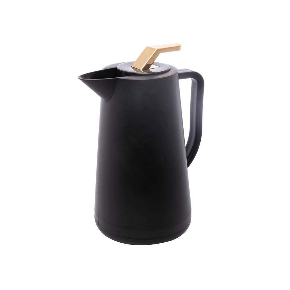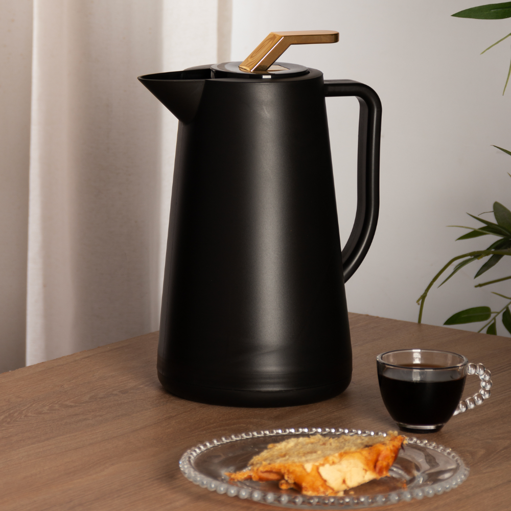 A garrafa térmica Atenas é uma opção moderna e funcional para manter bebidas quentes ou frias por mais tempo. Com design elegante em acabamento fosco preto e alça integrada, oferece praticidade no uso diário, além da tampa com detalhe dourado que adiciona sofisticação ao visual. Produzida em plástico resistente, é leve, fácil de transportar e perfeita para compor a mesa ou acompanhar rotinas cheias. Ideal para cafés, chás, água quente ou outras bebidas que exigem conservação térmica.