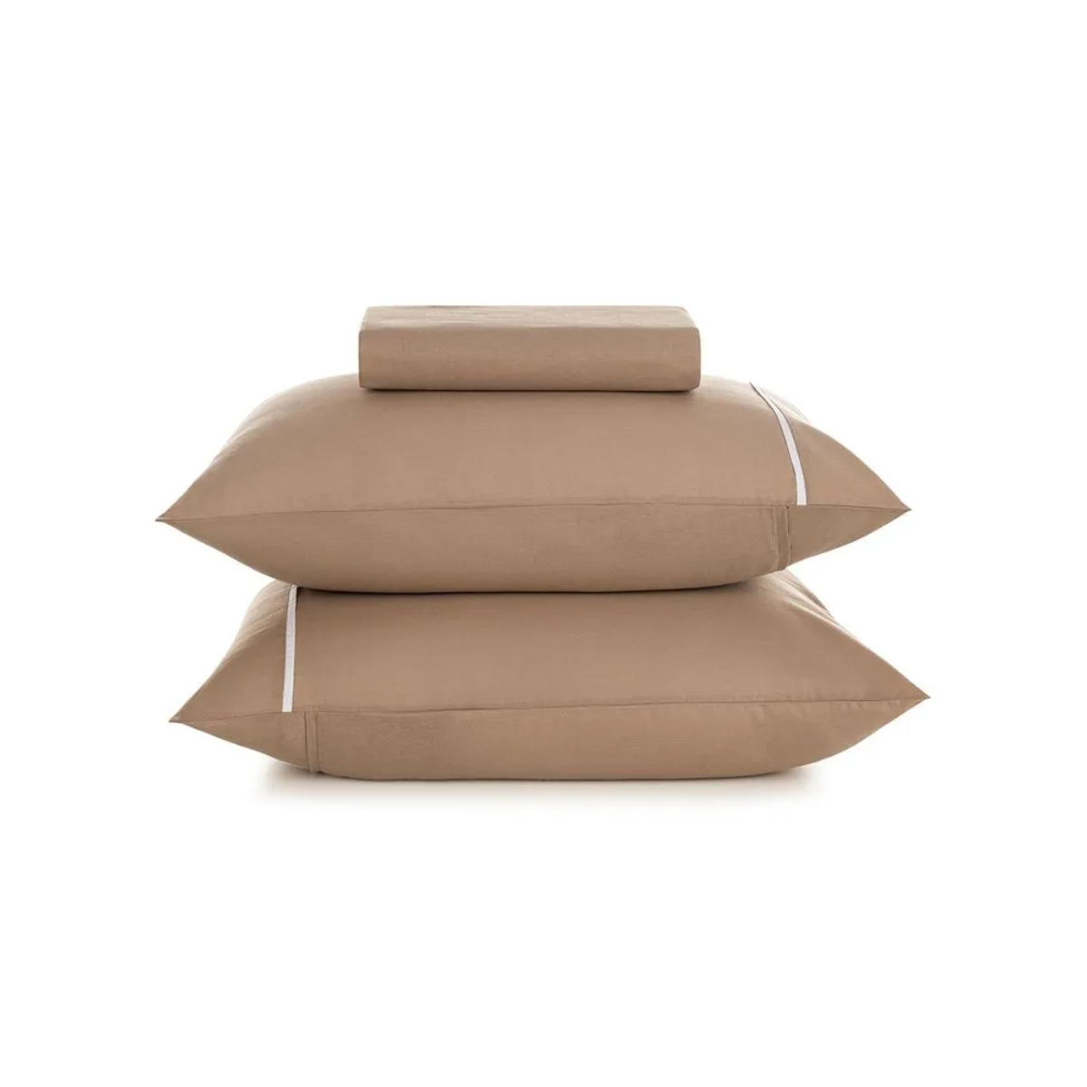 O Jogo de Lençol King Noah é ideal para quem busca sofisticação e conforto superior. Produzido em 100% algodão de 160 fios, apresenta tecido macio, encorpado, hipoalergênico e resistente ao pilling. Com design liso em caramelo e filete branco, deixa o quarto mais aconchegante e elegante.