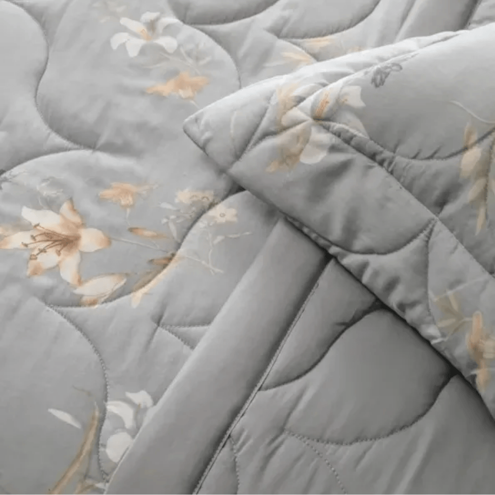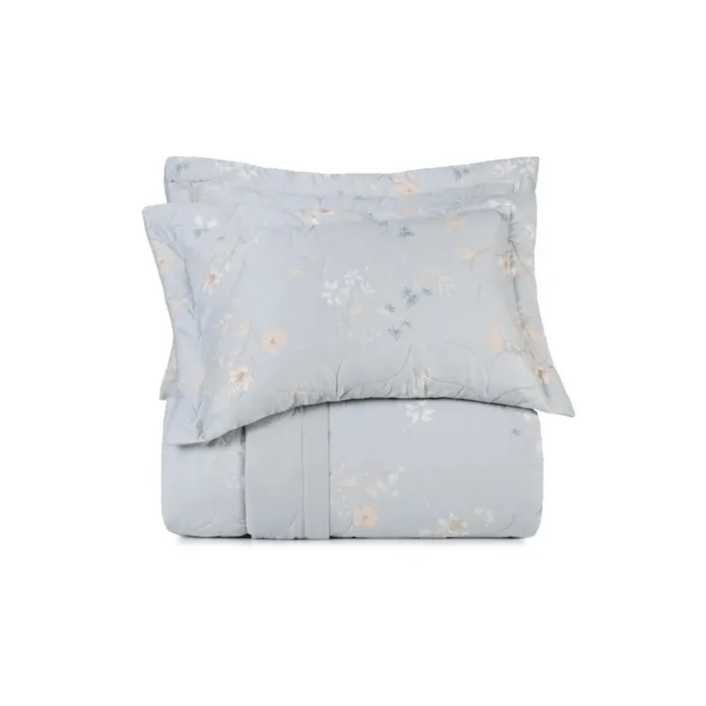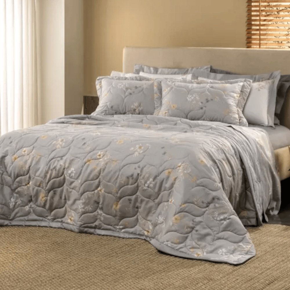 Jogo de colcha em cetim 300 fios 100% algodao, com toque ultramacio e acabamento matelassado que garante conforto, sofisticação e caimento impecavel. A estampa floral delicada traz leveza ao ambiente, enquanto o design dupla face permite variar o visual com praticidade. Os porta-travesseiros possuem abas amplas e ziper invisivel, proporcionando acabamento perfeito e facilidade na arrumacao. Ideal para quem busca qualidade superior, durabilidade e uma decoracao elegante para o quarto.