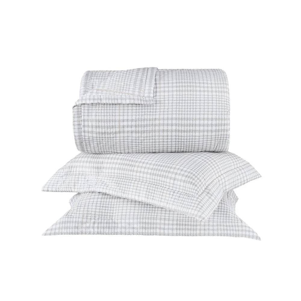 Inspirado no clássico xadrez Príncipe de Gales, o jogo de colcha Castillo combina sofisticação e conforto em uma composição elegante e atemporal. Produzido em 200 fios de puro algodão com fibras longas, proporciona toque suave, frescor e alta durabilidade. O conjunto inclui porta-travesseiros em tonalidade contrastante, realçando o design refinado e a nobreza do tecido. Ideal para quem busca um ambiente de descanso com requinte e aconchego.