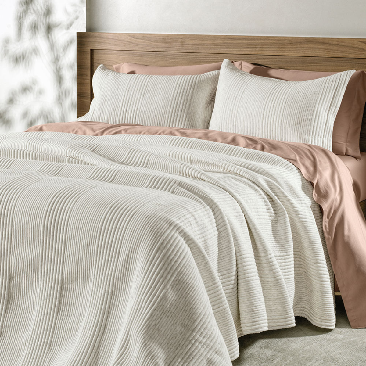 A Colcha Dantas Branco Névoa une leveza, praticidade e sofisticação em um só produto. Produzida em tecido 100% poliéster, garante maciez, resistência e durabilidade no uso diário. Seu matelassado geométrico com efeito mescla adiciona um toque delicado e elegante, enquanto a tonalidade branco com névoa transmite frescor e serenidade ao ambiente. Os porta-travesseiros acompanham a peça com acabamento em abas de 5 cm, conferindo sofisticação e um visual impecável para sua cama Queen.