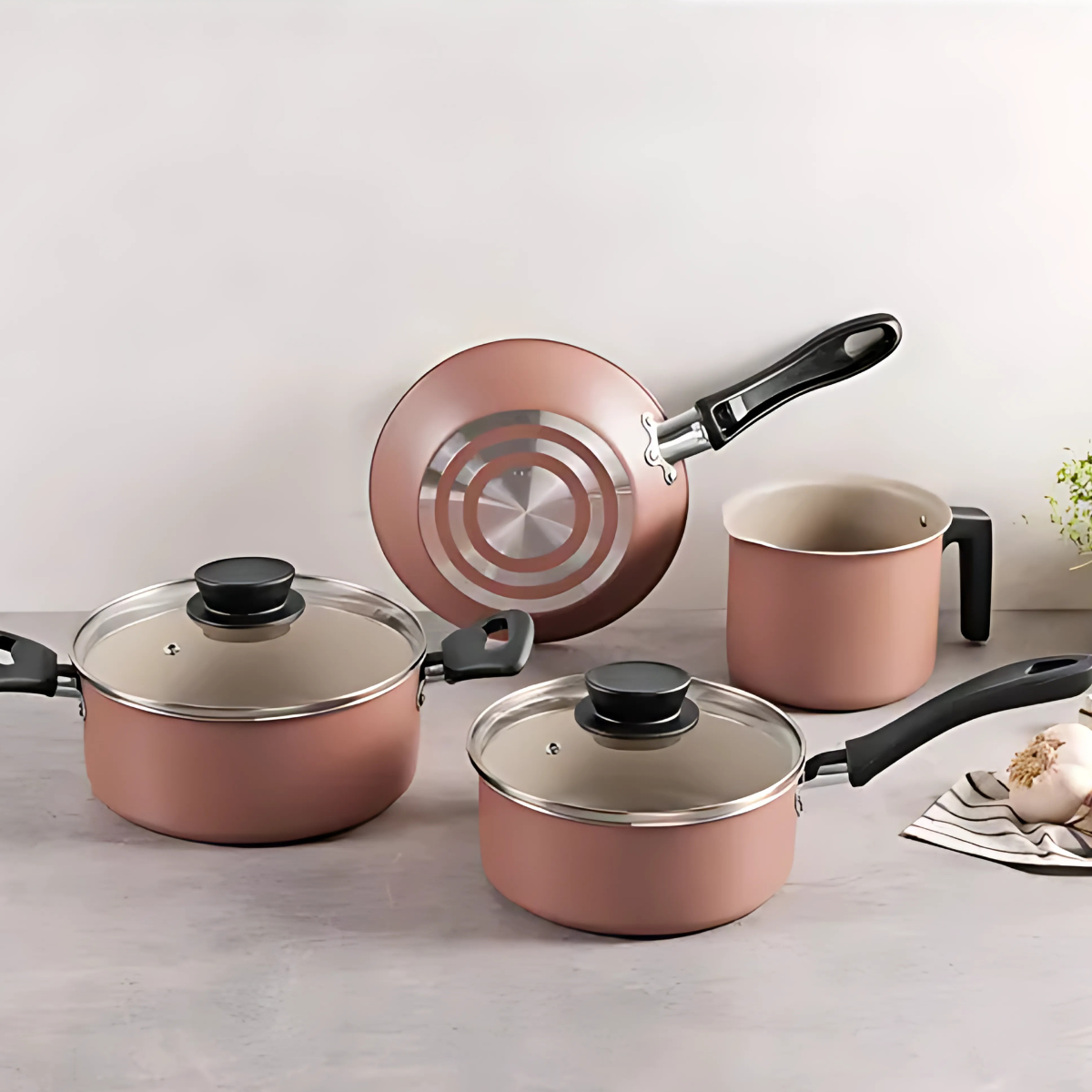 Cor, delicadeza e eficiência para a sua cozinha com o jogo de panelas Tramontina Linz em alumínio com revestimento interno e externo em antiaderente Starflon Max. Ideal para quem busca praticidade e qualidade, o conjunto garante cozimento rápido e uniforme, além de evitar que os alimentos grudem. As tampas em vidro temperado com bordas em aço inox permitem acompanhar o preparo, enquanto cabos e alças em baquelite antitérmico, com pegadores de nylon, asseguram segurança no manuseio. Versátil, pode ser utilizado em fogões a gás, elétricos e vitrocerâmicos, e todas as peças podem ir à lava-louças, facilitando ainda mais o dia a dia.