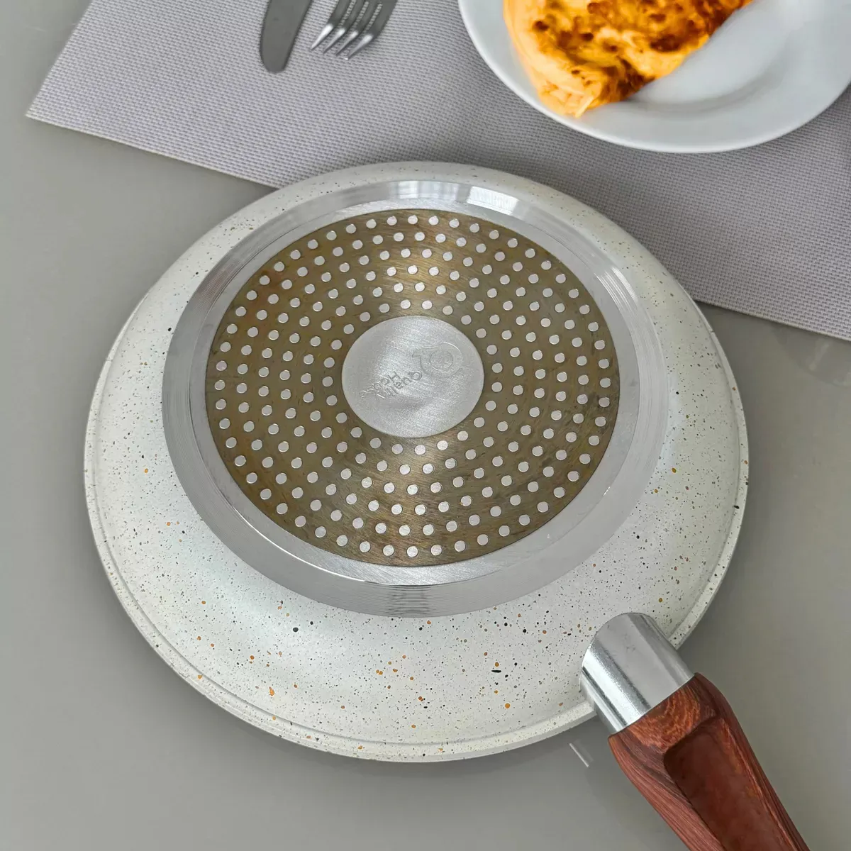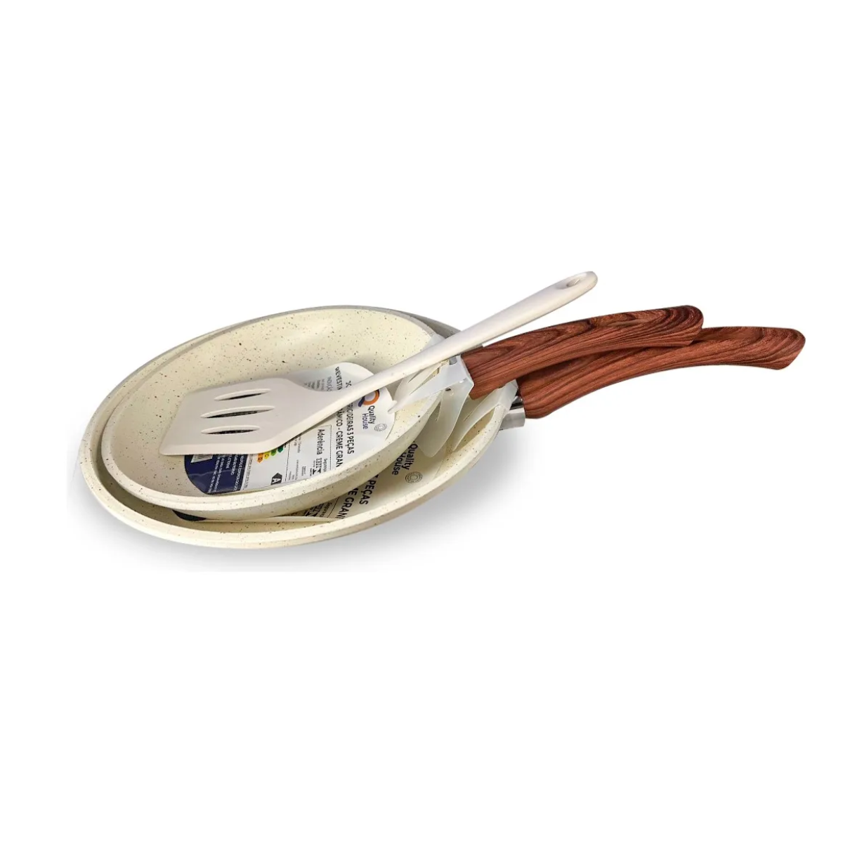 O Kit conta com duas frigideiras de 20cm e 24cm com revestimento nanocerâmico de alta performance na cor granito creme, proporcionando praticidade e um visual moderno para sua cozinha. O revestimento é antiaderente, garantindo preparo saudável dos alimentos e fácil limpeza. Acompanha espátula de silicone que não danifica as superfícies, completando o conjunto com funcionalidade e estilo.