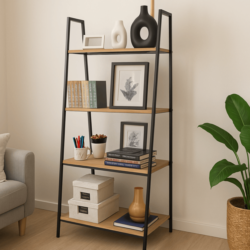 Organizador de quatro andares desenvolvido com estrutura em ferro resistente e prateleiras em MDF de acabamento amadeirado. O design moderno combina linhas retas com um visual leve e funcional, perfeito para compor salas, escritórios, quartos ou áreas de convivência. Suas prateleiras amplas oferecem excelente capacidade para livros, itens decorativos, caixas organizadoras e objetos do dia a dia, mantendo tudo sempre acessível e bem distribuído. A estrutura metálica garante firmeza, enquanto o MDF traz um toque de aconchego e elegância ao ambiente.
