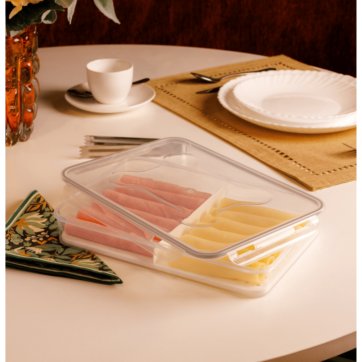 O porta frios com divisória e tampa hermética é a escolha ideal para manter seus alimentos frescos, organizados e protegidos com praticidade. Produzido em plástico resistente na cor branca, o recipiente possui divisória interna que facilita a separação de diferentes frios, queijos ou embutidos em um só lugar.