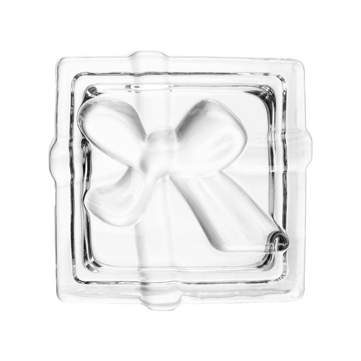O potiche de cristal ecológico com laço de fita é uma peça charmosa e sofisticada para compor sua decoração com delicadeza e funcionalidade. Seu design em formato de caixa com tampa e acabamento facetado garante brilho e elegância em qualquer ambiente, enquanto o detalhe em relevo no topo simula um laço, remetendo a um presente especial.