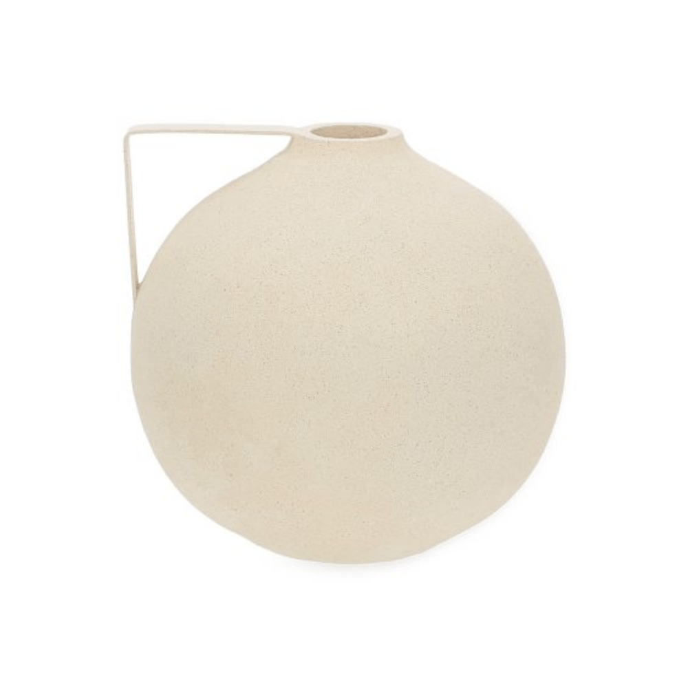 Vaso decorativo em polirresina com design arredondado e acabamento fosco, trazendo um visual moderno e minimalista para qualquer ambiente. Sua alça lateral metálica cria um contraste elegante e acrescenta personalidade à peça, que pode ser usada sozinha ou em composições com outros elementos decorativos. Ideal para aparadores, mesas laterais e estantes, adicionando sofisticação com uma estética clean.