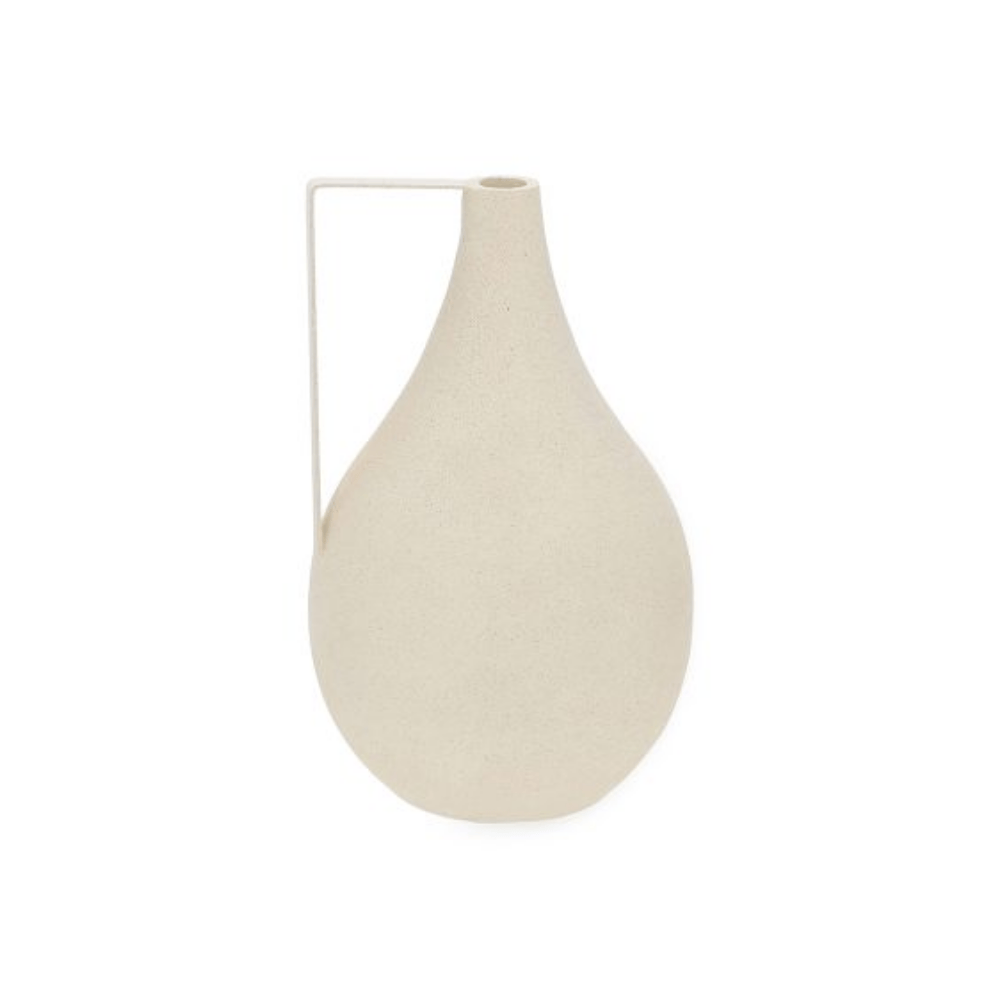 Vaso decorativo em polirresina com design contemporâneo e formato orgânico que transmite leveza ao ambiente. A alça lateral alongada cria um visual artístico e moderno, ideal para composições minimalistas, nichos, aparadores e centros de mesa. O acabamento fosco e texturizado ressalta a tonalidade off white, tornando a peça elegante e versátil para combinar com diferentes estilos de decoração.
