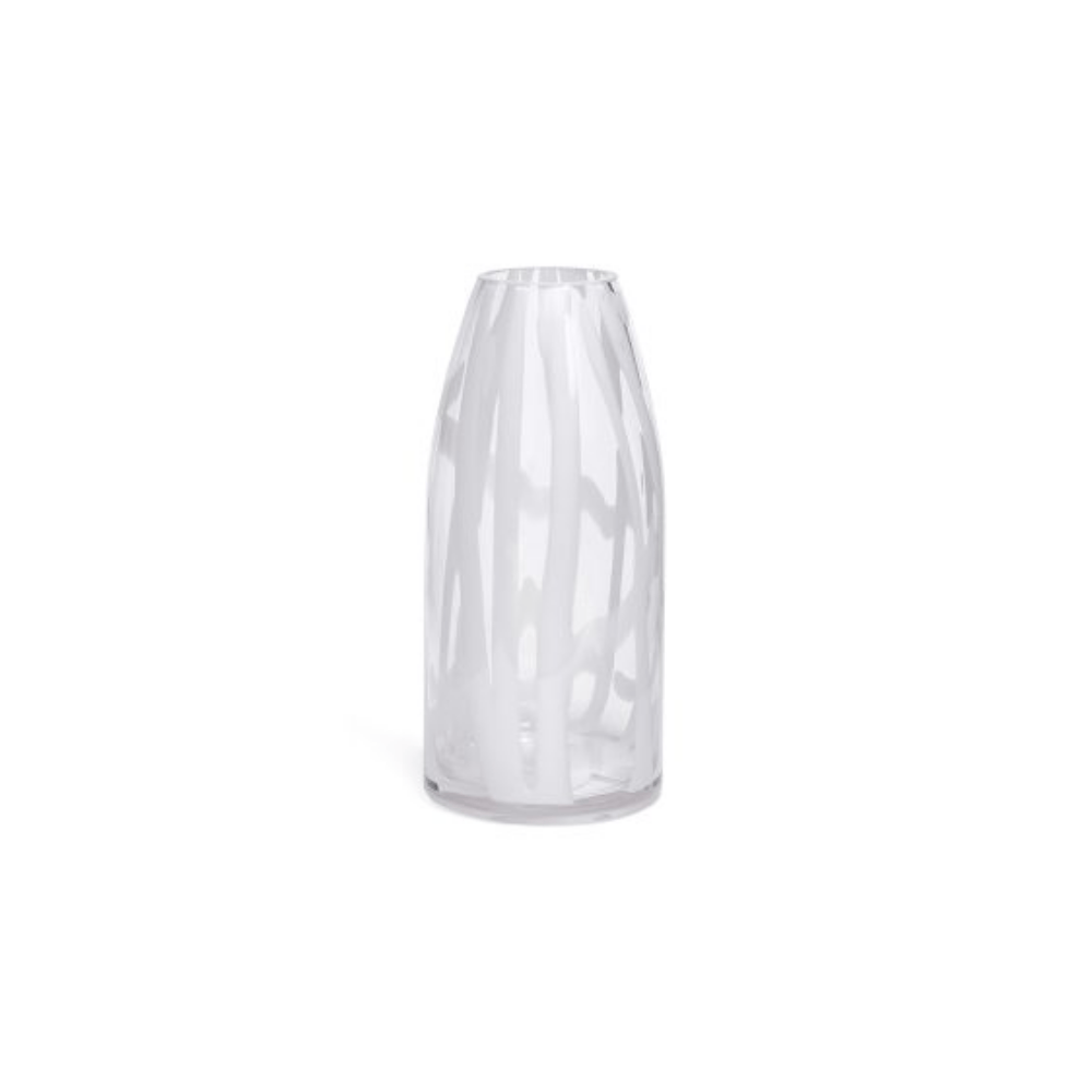 Vaso decorativo em vidro com design moderno e detalhes brancos internos que criam um efeito artístico elegante. A forma cilíndrica levemente afunilada traz equilíbrio visual e permite compor arranjos florais delicados ou utilizá-lo como peça decorativa isolada. Um item versátil, que adiciona leveza e sofisticação a diferentes estilos de ambiente.
